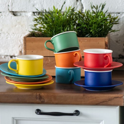 ,- ровная форма чашки, - белый кант по верхнему краю - современное матовое покрытие, - блюдце с углублением , ,Эта чайная пара – яркий и стильный акцент любого офиса или дома. Ровная форма чашки с гладким матовым покрытием напоминает всеми любимый вафельный стаканчик с мороженым, отсюда и «сладкое» название комплекта – ICE CREAM. Сегодня матовое покрытие особенно востребовано и популярно в дизайне: оно привлекает и манит, очаровывая бархатной глубиной цвета. С матовым покрытием товары выглядят более презентабельно и дорого: не только посуда, но и помады, лаки для ногтей, краска для стен и даже автомобили. Нежный белый кант по верхнему краю дополняет ассоциацию с тающим мороженым, а блюдце с углублением не позволит чашке случайно соскользнуть. Большое количество цветов в линейке поможет подобрать идеальный корпоративный подарок в цвет логотипа или, напротив, раскрасит офисные будни разнообразием оттенков. , Цвет близкий,к Pantone 348С