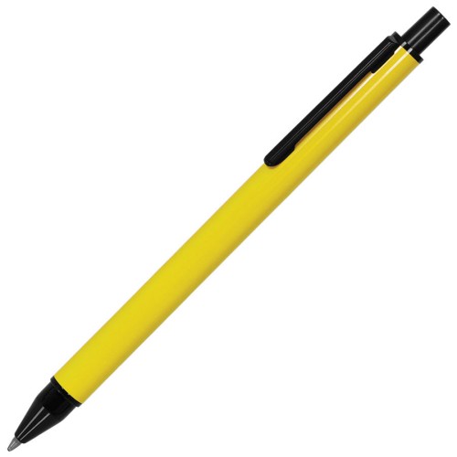 Яркая металлическая ручка простой формы - универсальный носитель рекламного сообщения. Цвет, близкий к Pantone 012C. Стержень Plastic Parker Type, синий, толщина пишущего узла 1 мм