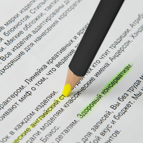 Карандаш-текстовыделитель двухсторонний, двухцветный. Мягкий грифель класса А позволяет легко выделить нужный фрагмент текста.,Текстовыделители маркерного типа достаточно сложный продукт с ограниченным сроком годности и специальными условиями хранения. Преимущество данной модели в том, что карандаш не имеет срока годности, не течет и не пачкает руки.,,• Pantonee близкий к Black• 2 ярких неоновые цвета (желтый и зеленый)• Трехгранный утолщенный корпус из высококачественной древесины• Многослойная прокраска корпуса• Прочный грифель 5.0 мм класса А• Легко затачивается