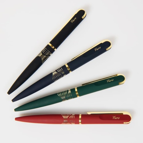 Глубокий насыщенный оттенок и бархатистая поверхность ручки FARO создают благородный контраст с отделкой цвета желтого золота. Оригинальный клип, скругленный в верхней части, напоминает о роскошных украшениях и символах власти.Это прекрасный выбор как для именного подарка бизнес-партнеру, так и для рекламы собственного бренда.Нижняя часть ручки выполнена из нержавеющей стали, при гравировке “Soft touch” покрытия вскрывается зеркальная подложка в цвет отделки. Верхняя часть ручки и клип - из пластика, гравировка возможна на определенных настройках.,• Pantone,,близкий к 532С.• Металлический корпус и клип.,• Поворотный механизм подачи стержня.• Пулевидный пишущий узел 1.0 мм с шариком из карбида вольфрама.• Длина линии письма 1000 - 1200 м.• Чернил Dokumental, цвет синий.• Сменный стержень Cross type.• Угол поворота корпуса: 270°.• Виды нанесения: лазерная гравировка, тампопечать.!!! Оттенки золотого цвета на верхней и нижней части корпуса ручки могут отличаться.