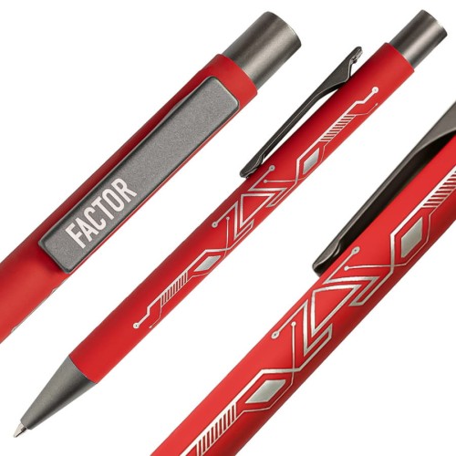 Модель ручки FACTOR – это оптимальный выбор для тех, кто предпочитает добротное качество, надежность и изящную простоту. Этой ручкой писать легко и удобно, она буквально скользит по бумаге благодаря качественным чернилам и надежному пишущему узлу. Все эти качества позволят ручке служить вам верой и правдой долгое время. А клип ,и корпус данной модели отлично подойдут для нанесения вашего логотипа.,• Pantone, близкий к 200 С• Размер 140*10 мм• Корпус из алюминия с покрытием soft touch• Металлический клип-прищепка серого цвета • Пластиковые носик и кнопка в цвет клипа• Нажимной механизм подачи стержня• Пулевидный пишущий узел 1.0 мм• Длина линии письма 1000 м,• Чернила Dokumental. Цвет чернил синий• Сменный стержень Parker type• При гравировке вскрывается натуральный цвет алюминия, который может быть либо более белый, либо более серого оттенка.Результат гравировки зависит от настроек оборудования!
