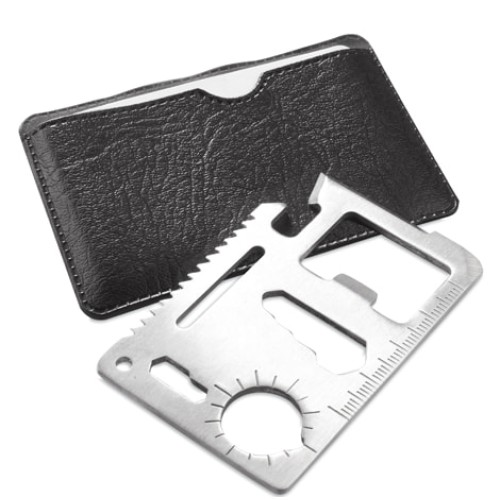 Универсальный инструмент в корпусе из нержавеющей стали с 11 функциями. С консервным ножом, ножом, отверткой, линейкой, открывалками для бутылок, гаечными ключами, ключами-бабочками, пилой и транспортиром. Представлен в прочном кожаном футляре.