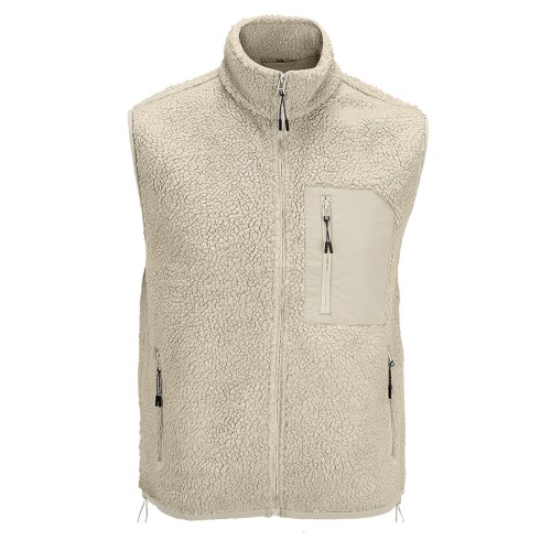 Жилет унисекс из искусственного меха шерпа с карманами на молнии: 1 нагрудным из таслана для нанесения логотипа и 2 боковыми. Черные пуллеры на молниях со светоотражающими элементами.,Слегка удлиненная спинка.,Эластичный шнурок по низу изделия.,