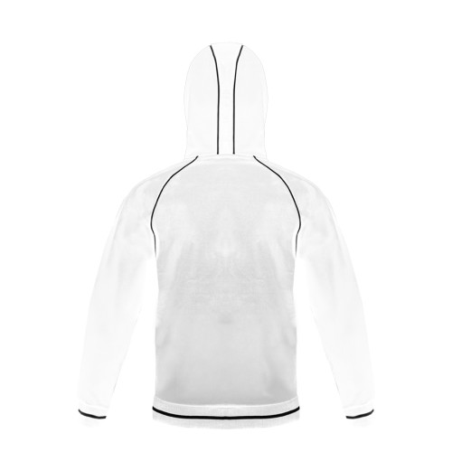 Основная ткань: цвет, близкий к Pantone Standart white,,Толстовка из полотна "пике" с водоотталкивающей пропиткой.,Обратные контрастные молнии для предотвращения попадания влаги внутрь.,Рукава-реглан.,Декоративная тесьма по горловине спинки.,Капюшон на подкладке с небольшой стойкой.,Контрастные канты и шнур в капюшоне.,Два передних кармана на молнии.,Манжеты и низ изделия обработаны плотным рибом 1*1 .
