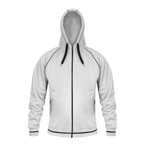 Основная ткань: цвет, близкий к Pantone Standart white,,Толстовка из полотна "пике" с водоотталкивающей пропиткой.,Обратные контрастные молнии для предотвращения попадания влаги внутрь.,Рукава-реглан.,Декоративная тесьма по горловине спинки.,Капюшон на подкладке с небольшой стойкой.,Контрастные канты и шнур в капюшоне.,Два передних кармана на молнии.,Манжеты и низ изделия обработаны плотным рибом 1*1 .