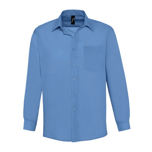 Мужская рубашка из смесового поплина с длинным рукавом. Смесовый поплин обеспечивает максимальный комфорт, лёгок в уход, не мнется. Стандартный крой (прямой). Длинный рукав. Жесткий воротник. Планка с 7 пуговицами в цвет изделия. Нагрудный карман слева. , Цвет близкий к PANTONE 7454C