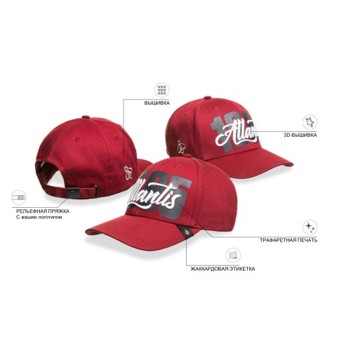 ,6 клиньев ,Металлическая застежка с конгевом, ,100%хлопок, 280гр/м2, твил, ,3Д-вышивка поверх принта на передней панели ,Плоская вышивка на боковой панели, ,Жаккардовый лейбл на козырьке ,Цены: ,При заказе 576 шт. – 1987р. ,При заказе 1008 шт. – 1599р. Изготовление и доставка образцов в Москву – 60 дней, Производство и доставка партии в Москву – 180 дней. ,При авиадоставке срок сокращается до 60 дней, цена изделия увеличивается на 370р. Все логотипы на образце сделаны справочно для вашего ознакомления и будут изменены в соответствие с вашим дизайном в процессе производства. 58 см - минимальный размер, с помощью застёжки его можно увеличить до необходимого.
