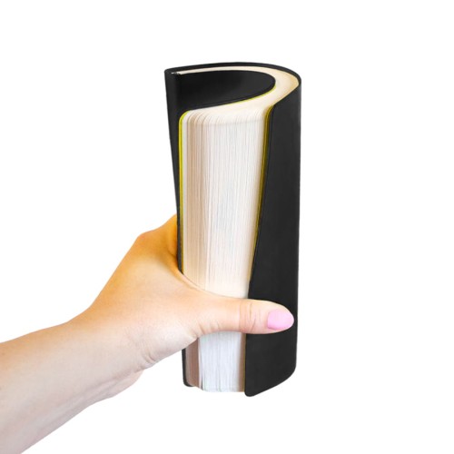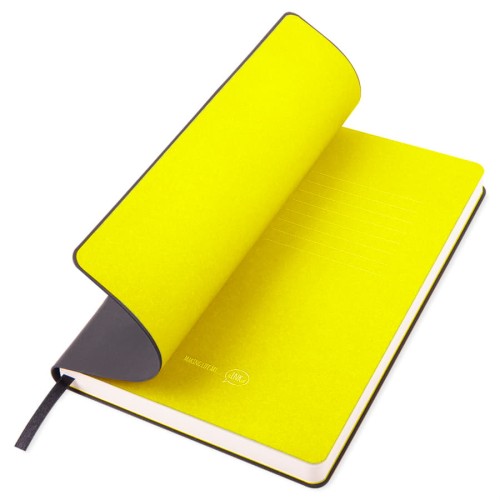 Блокнот,с мягкой термоактивной обложкой и,популярной,комбинацией цветов Термоактивный PU материал,Velvet Цвет обложки, близкий к Pantone Black C Цвет форзаца, близкий к Pantone Yellow U Внутренний блок 256 страниц,в линейку Идеально скругленные углы блока Перфорированные,8 последних листов Кремовая FSC бумага,70 г/м2 Ляссе в тон обложки Индивидуальная упаковка: фирменный сливбокс thINKme