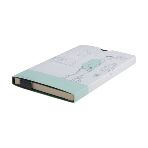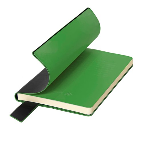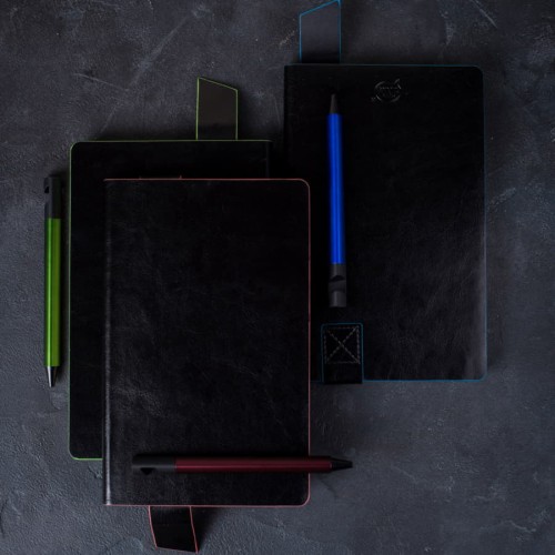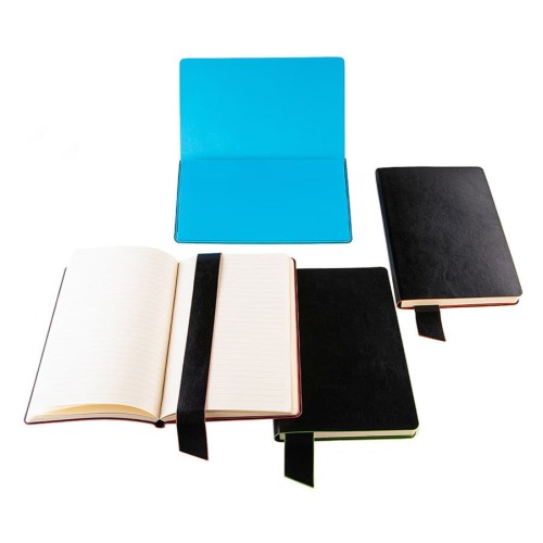 Размер блокнота 130*210 мм.,Имитирующая натуральную кожу мягкая PU обложка Bondy черного цвета по краям имеет яркую цветовую отделку.,Широкая закладка из аналогичного PU также контрастно окрашена по краям.,Форзац и нахзац в тон цветному канту обложки.,Цвет форзаца/нахзаца и отделки обложки близок к pantone 2426C.,Внутренний блок 256 страниц в линейку.,Идеально скругленные углы блока.,Перфорированные 8 последних листов.,Кремовая eco-friendly FSC бумага 70 г/м2.,Карман для записок в тон нахзаца.