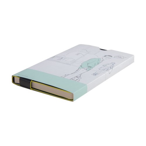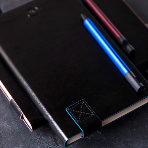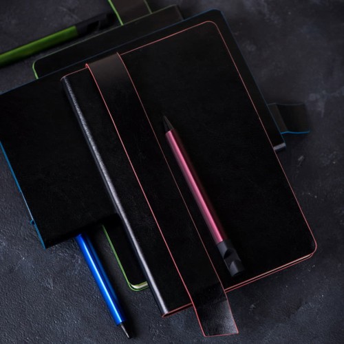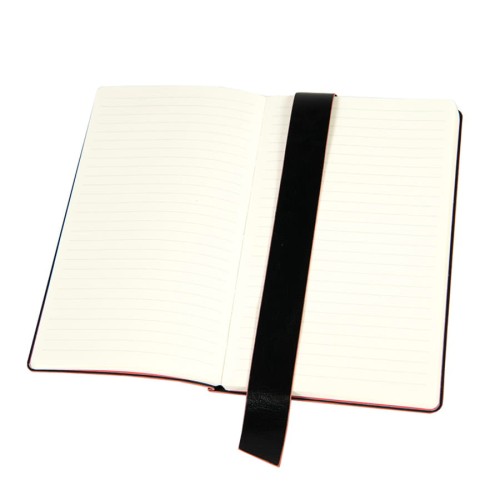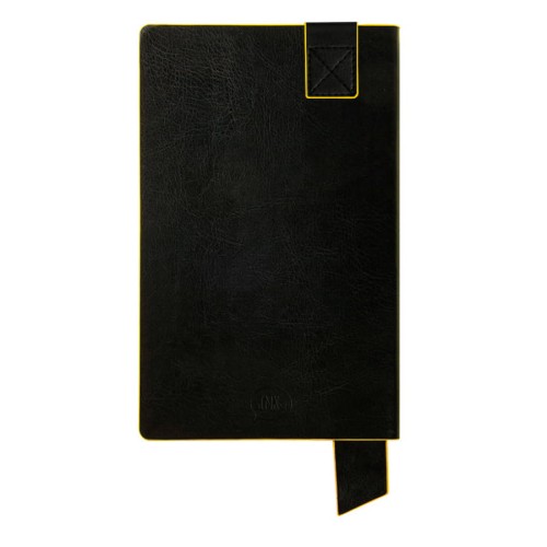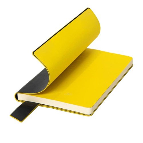 Размер блокнота 130*210 мм.,Имитирующая натуральную кожу мягкая PU обложка Bondy черного цвета по краям имеет яркую цветовую отделку.,Широкая закладка из аналогичного PU также контрастно окрашена по краям.,Форзац и нахзац в тон цветному канту обложки.,Цвет форзаца/нахзаца и отделки обложки близок к pantone YellowU.,Внутренний блок 256 страниц в линейку.,Идеально скругленные углы блока.,Перфорированные 8 последних листов.,Кремовая eco-friendly FSC бумага 70 г/м2.,Карман для записок в тон нахзаца.