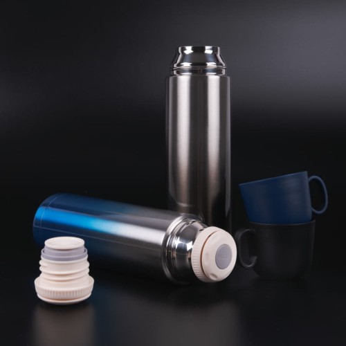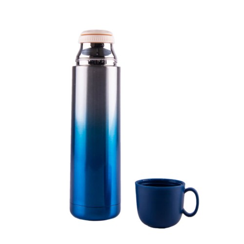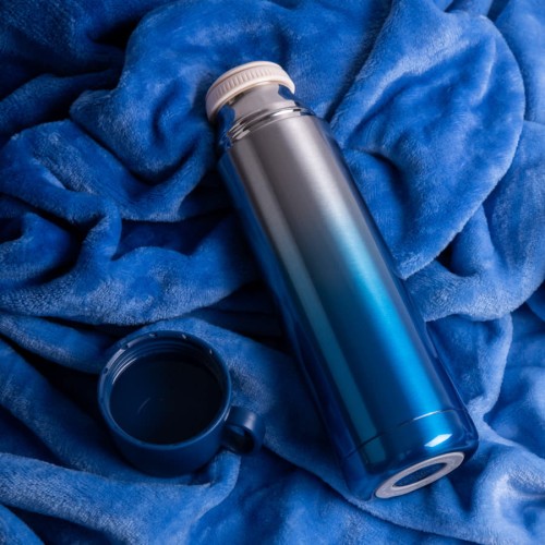 Вакуумный термос Gradient с двойными стальными стенками. Очень удобная форма крышки-чашки. Отделка - плавный градиент из серебряного в насыщенный синий цвет. , Сохраняет тепло,до 12 часов,в зависимости от температуры окружающей среды.