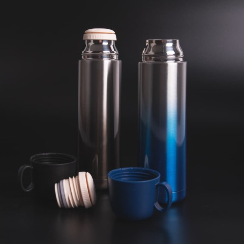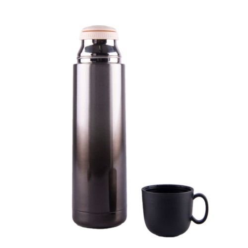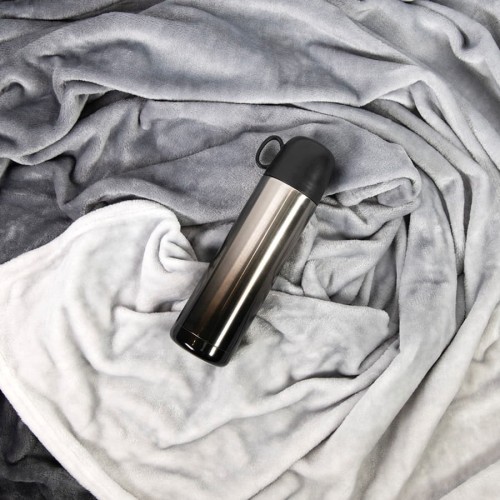 Вакуумный термос Gradient с двойными стальными стенками. Очень удобная форма крышки-чашки. Отделка - плавный градиент из серебряного в угольно-черный цвет. , Сохраняет тепло,до 12 часов,в зависимости от температуры окружающей среды.