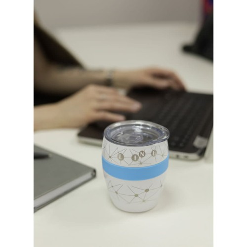 Термокружка,LINE с двойными стальными стенками сохранит напиток горячим до 3х часов, холодным - до 4х часов.Благодаря форме удачно лежит в руке, и за счет резинового браслета не скользит. Высота без крышки 9,7 см, подходит для большинства кофемашин.