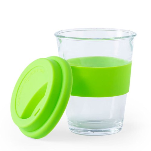 Стеклянный стакан с цветной силиконовой крышкой и манжетой. Манжета обеспечивает безопасность ваших рук при использовании стакана для горячих напитков. Индивидуальная упаковка - белая картонная коробка с изображением продукта.