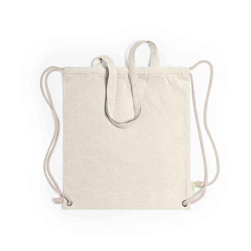 Сумка-рюкзак для покупок выполнен из 100% переработанного хлопка, плотностью 140 г/м2. Близкий к, Pantone Beige 4675 C Переработанный хлопок получается из отходов текстильного производства или из старой одежды. Исходный материал измельчается, потом из этой массы вытягивают нити, из которых ткут новую ткань. В переработанных тканях модная индустрия видит будущее. И оно уже здесь. Сумки, созданные из переработанного хлопка, ничуть не хуже «первичных». Они не отличаются на ощупь и служат так же долго, как и модели из не переработанного материала. Ручки для переноски 70 см и, шнуры из хлопкас усиленными металлическими люверсами. Сумка выдерживает нагрузку до,9 кг.