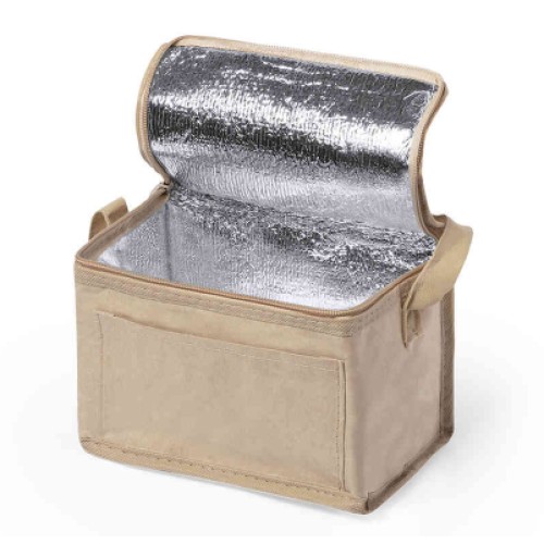 Сумка-холодильник вместимостью 6 банок. Изготовлена из ламинированной бумаги, устойчивой к влажности, с изотермической внутренней отделкой из алюминия. Застежка-молния и ручка для переноски соответствующего цвета, с внешним карманом для печати.