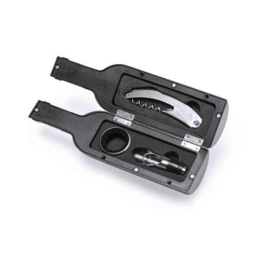 Набор для вина в футляре в виде бутылки. В комплекте 3 самых необходимых предмета – нож сомелье со штопором, воронка и каплеуловитель. Индивидуальная упаковка из картона с изображением продукта