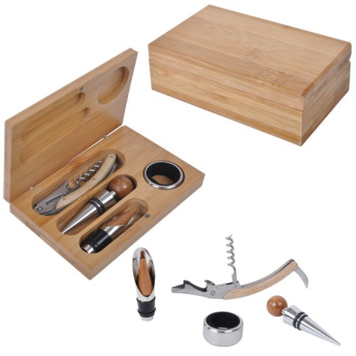 В комплекте: нож сомелье со штопором, пробка, воронка, каплеуловитель , Стильный набор для вина в коробочке из бамбука – одного из самых востребованных материалов для кухонных принадлежностей. В комплекте 4 самых необходимых предмета – нож сомелье со штопором, пробка, воронка, каплеуловитель. Благодаря этому благородному комплекту вино будет удобно как открыть, так и хранить, а надежный футляр из натурального материала с гравировкой будет смотреться просто великолепно! Предметы набора безопасны и гигиеничны в использовании, прослужат долго и станут доброй традицией не одного поколения! Достойный и востребованный подарок друзьям, коллегам, партнерам, клиентам, посетителям и гостям.Внимание! На задней панели присутствуют круглые ножки (уплотнитель)
