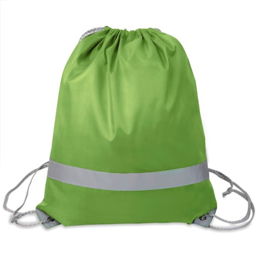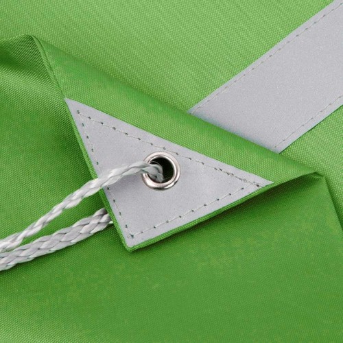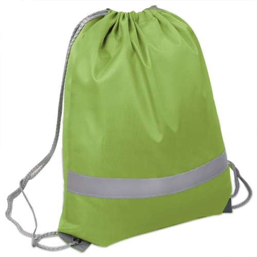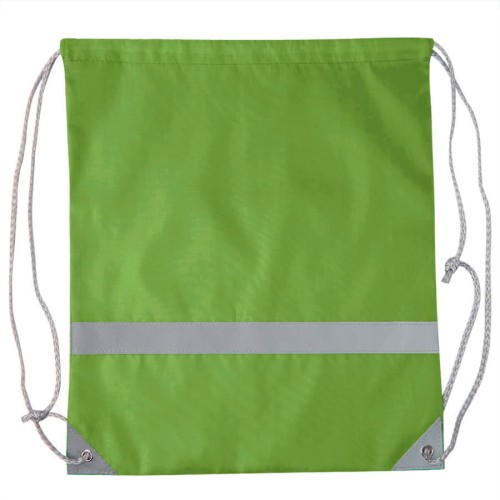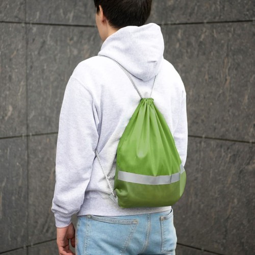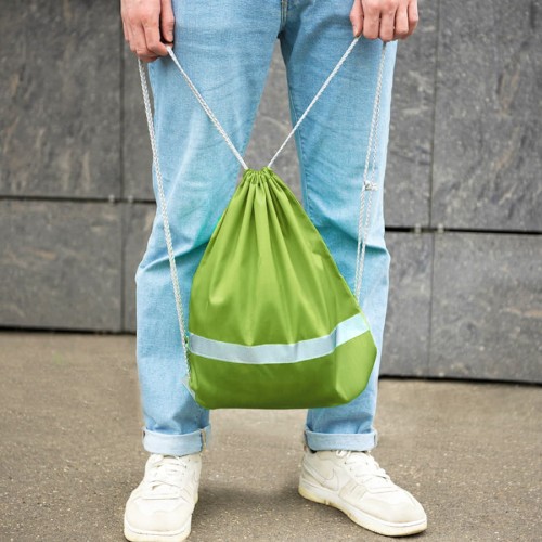Просто и безопасно!,Рюкзак-мешок RAY из полиэстера 210Dсо светоотражающей полосой спереди,,светоотражающими уголками,усиленными металлическими люверсамиЛегко и просто затягивается по верхней части серыми шнурами.Зелёный цвет близкий к Pantone 2292 U