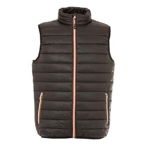 Основная ткань: цвет, близкий к Pantone 432 C, подкладка: цвет, близкий к Pantone 430 C Легкий жилет из нейлона. Небольшой воротник-стойка. Контрастная облегленная пластиковая молния со съемным пуллером. Два передних кармана на молнии. Один внутренний карман на липучке. Cтягивающая эластичная резинка по низу изделия и в рукавах.