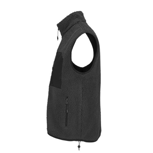 Жилет унисекс из искусственного меха шерпа с карманами на молнии: 1 нагрудным из таслана для нанесения логотипа и 2 боковыми. Черные пуллеры на молниях со светоотражающими элементами.,Слегка удлиненная спинка.,Эластичный шнурок по низу изделия.,