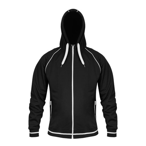 Толстовка из полотна "пике" с водоотталкивающей пропиткой.,Обратные контрастные молнии для предотвращения попадания влаги внутрь.,Рукава-реглан.,Декоративная тесьма по горловине спинки.,Капюшон на подкладке с небольшой стойкой.,Контрастные канты и шнур в капюшоне.,Два передних кармана на молнии.,Манжеты и низ изделия обработаны плотным рибом 1*1 .