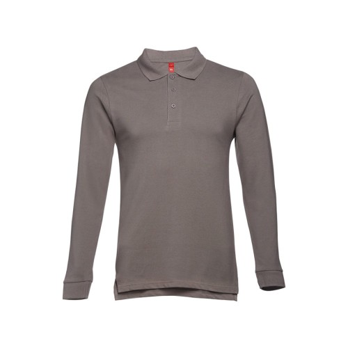 Мужская рубашка-поло с длинным рукавом из хлопковой ткани-пике.,Полотно футболки упругое и гладкое,благодаря обработке ферментами "enzyme wash" и,сохраняет форму при стирке.,Модель полуприлегающего силуэта. Благодаря манжете из риба 1х1 рукав смотрится очень аккуратно. Воротник также выполнен из риба 1х1, внутри ворота - укрепляющая тесьма по горловине. Планка с 3 пуговицами в цвет основной ткани изделия. Запасная пуговица на ярлыке во внутреннем боковом шве.Цвет, близкий к Pantone Cool Grey 10 C
