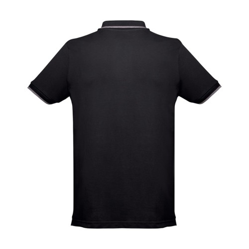 Мужская рубашка-поло из хлопковой ткани-пике.,Полотно футболки упругое и гладкое,благодаря обработке ферментами "enzyme wash" и,сохраняет форму при стирке.,Модель полуприлегающего силуэта. Благодаря манжете из риба 1х1 рукав смотрится очень аккуратно. Воротник также выполнен из риба 1х1, внутри ворота - укрепляющая тесьма по горловине. Манжета на рукавах и край воротника выполнены контрастным цветом. Планка с 3 контрастными пуговицами. Запасная пуговица на ярлыке во внутреннем боковом шве.Цвет канта, близкий к ,Pantone Cool Grey 10